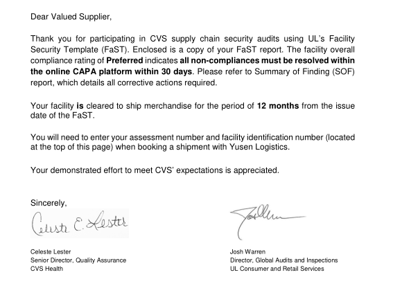 創(chuàng)思維驗廠沒有辜負工廠領(lǐng)導的信任,以快速、有效的驗廠方法與手段一次性順利通過UL 驗廠,一舉拿下VCS訂單,客戶滿意的寫下下列郵件: